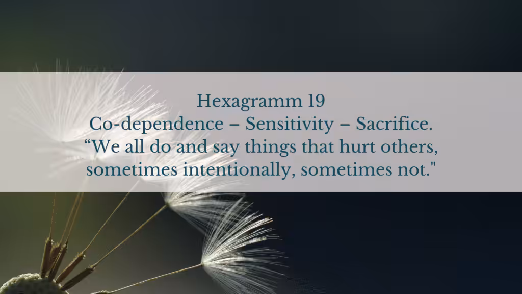 Hexagramm 19 ist ein Annähern, ein Herantasten an einen Zustand der Fülle, der einmal war, immer ist und wieder sein wird. Zeit ist nur ein Konstrukt und hat keine Bedeutung. Wir kommen aus der Abhängigkeit, befreien uns wie ein Wirbelwind von allem was nicht mehr stimmig ist und werden unabhängig (die 19 führt auf der gegenüberliegenden Kanalseite in die 49, das Tor der Revolution), um dann auf der höchsten Ebene wieder in eine Abhängigkeit zu gehen, diesmal aber eine die auf gegenseitiger Achtung und Wechselbeziehung (Interdependenz) beruht, in der wir erkennen, dass wir alle Finger an einer Hand sind, oder Haare auf einer Haut, Zellen in einem Organismus, der nur in gemeinsamer Harmonie funktionieren kann.