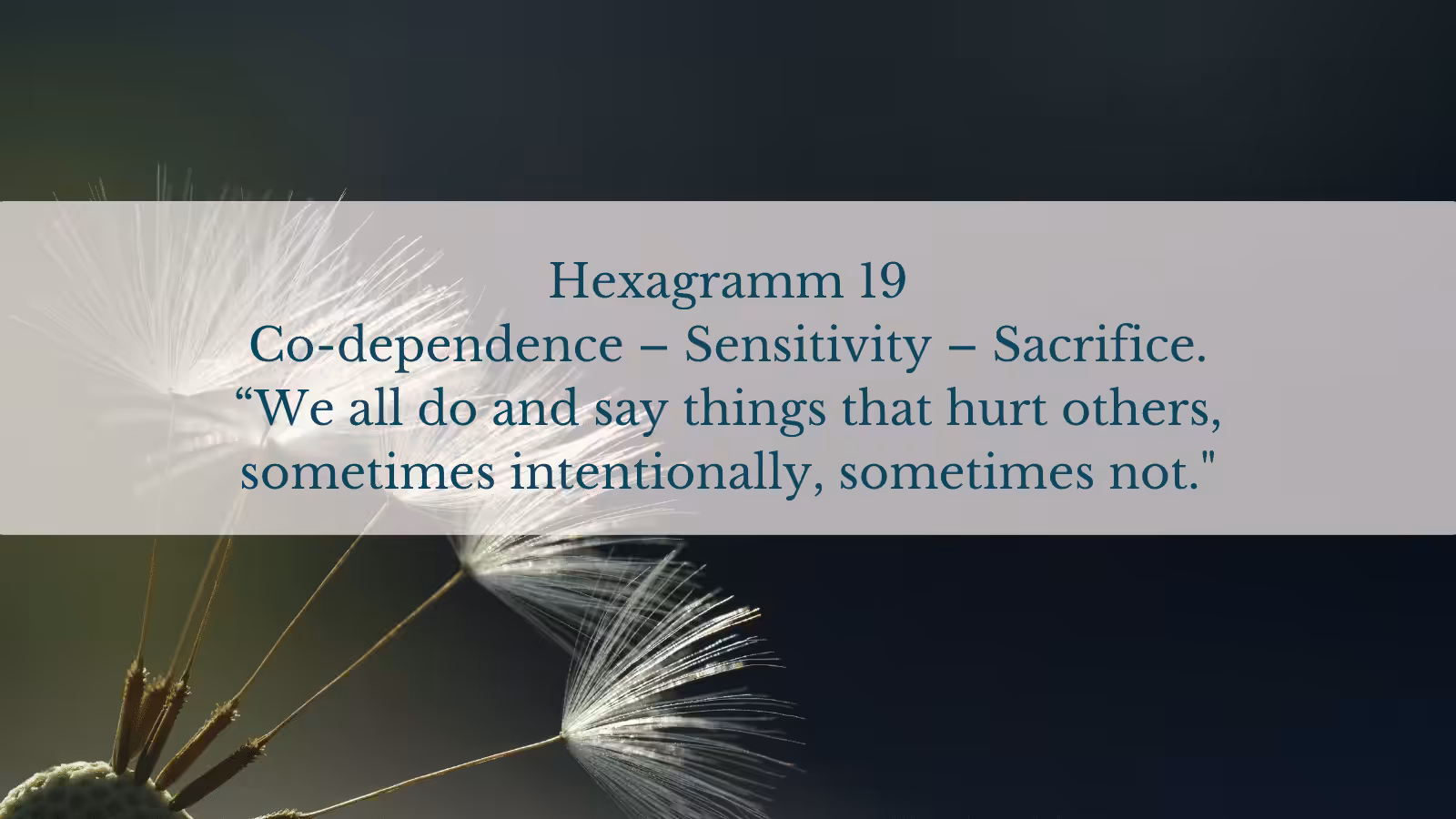 Angeblich soll der Schatten von Hexagramm 19, die Co-Abhängigkeit, der erste sein, der aus unserem Genmaterial verschwindet und wir treten in eine neue Ära der Blüte und der Verbundenheit mit Mutter Gaia, und all ihren Bewohnern ein. Aber noch ist es nicht soweit.